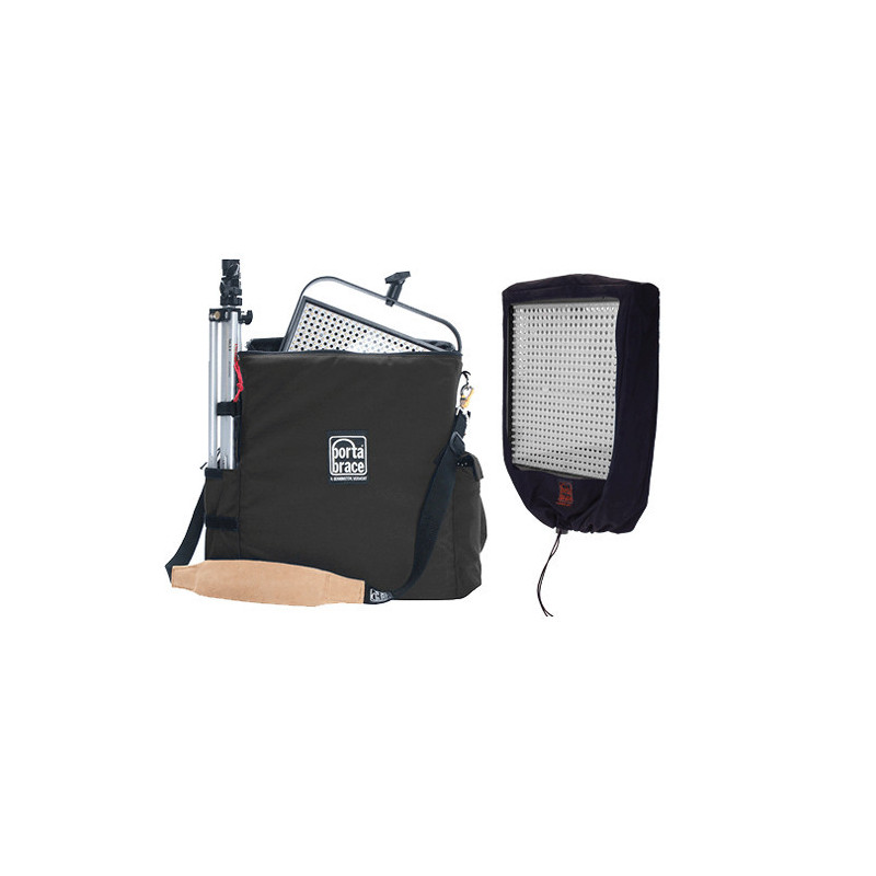 La borsa di trasporto PortaBrace LPB-LP1X1, di colore nero mezzanotte, è progettata per trasportare un pannello LED 1x1. Può contenere un Litepanels 1x1, un sistema fluorescente Kino Flo BarFly 100 o 200, un Kino Flo Desk-Lite, una lampada LED di produzione LEDZ BRUTE 16 o 30", o articoli di dimensioni simili. La borsa presenta un esterno in nylon Cordura 1000 denari resistente all'acqua e un vano principale imbottito con schiuma. È presente una schiuma spessa e imbottita a forma di U alla base della borsa per una protezione aggiuntiva contro le cadute. Dispone di una tasca esterna per un supporto di illuminazione sul lato, di una tasca esterna per cavi e batterie, e di una tasca interna morbida e imbottita per il trasporto di gelatine. Per trasportare più di un articolo, due borse possono essere collegate e trasportate come una sola. Può essere trasportata tramite una tracolla rimovibile e regolabile con un cuscinetto in camoscio. Questa borsa è prodotta nel Vermont, negli Stati Uniti.