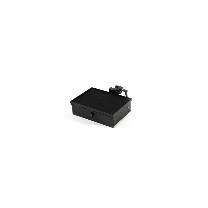 Il ripiano con cassetto adicam è l'accessorio perfetto in studio e all'esterno per il tuo laptop, permettendoti di aumentare il tuo spazio di lavoro e riporre tutti gli accessori necessari per la produzione audio/video. È rivestito con una morbida moquette che protegge sia gli oggetti nel cassetto che il cassetto stesso dai graffi. Ha una serratura a combinazione personalizzata a 3 cifre che garantisce la protezione totale delle tue preziose attrezzature. Progettato per essere montato su un tubo del carrello adicam, su qualsiasi stativo luci o supporto monitor utilizzando il Super Clamp.