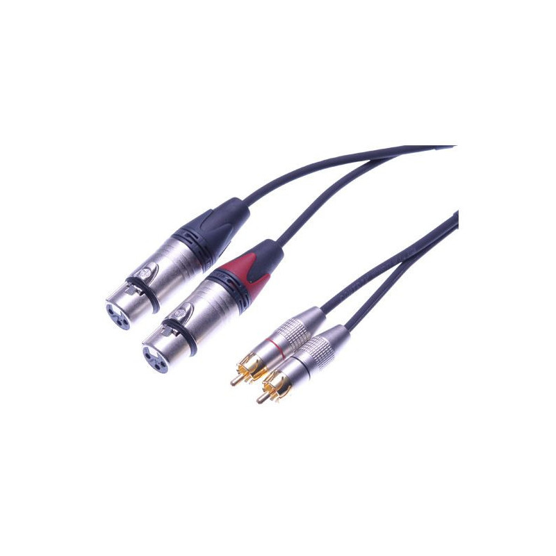 Cavo stereo nero ZNK 1/4-SIAM assemblato con 2 spine phono CAP3342/2-4 con contatti laminati placcati oro verso 2 connettori per cavo XLR femmina Neutrik NC3FXX con contatti argentati. Un canale presenta una marcatura rossa per una migliore differenziazione stereo.