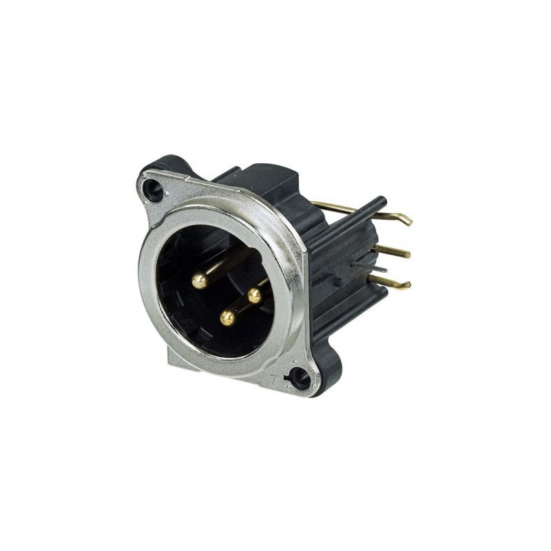 Connettore XLR maschio 3 pin, messa a terra: contatto di massa separato verso il corpo del connettore di accoppiamento e il pannello frontale, blocco in acciaio, montaggio angolato su circuito stampato.