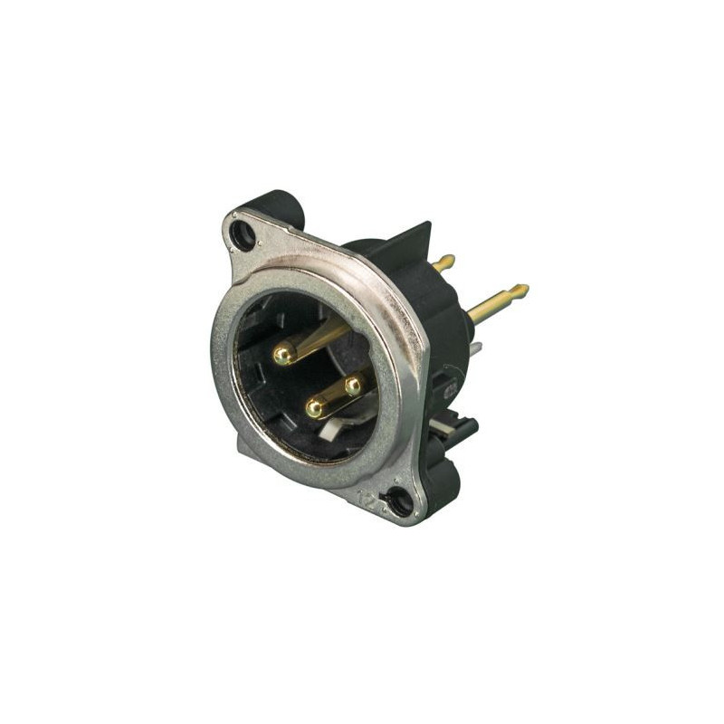 Presa XLR maschio a 3 poli, messa a terra: contatto di terra collegato all'alloggiamento, ma non al pannello anteriore e al pin 1, staffa di fissaggio in acciaio, montaggio verticale su PCB.