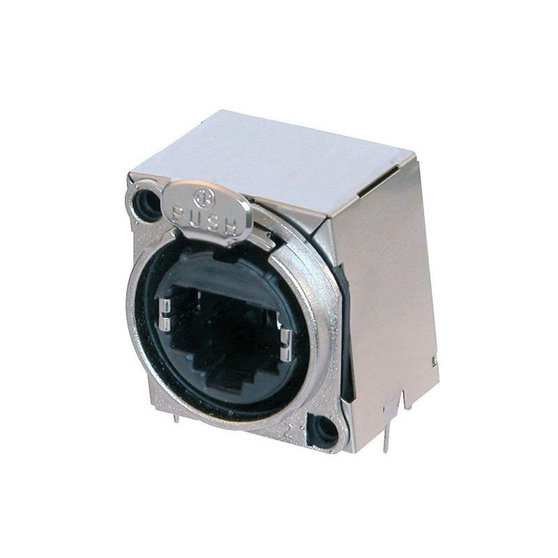 Presa RJ45 orizzontale schermata per montaggio su PCB, serie B con blocco del fermo, spessore massimo del pannello 3 mm. L'"etherCON schermato" offre un alloggiamento metallico chiuso per evitare interferenze elettromagnetiche o diafonia.