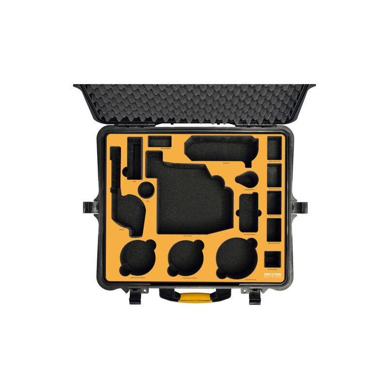 Questa custodia rigida impermeabile è dotata di un inserto in schiuma ad alta densità pretagliato su misura che accoglie la fotocamera e i suoi accessori. Una sovrapposizione gialla brillante aiuta a evidenziare ogni componente per un accesso più rapido quando si lavora in luoghi con scarsa illuminazione.