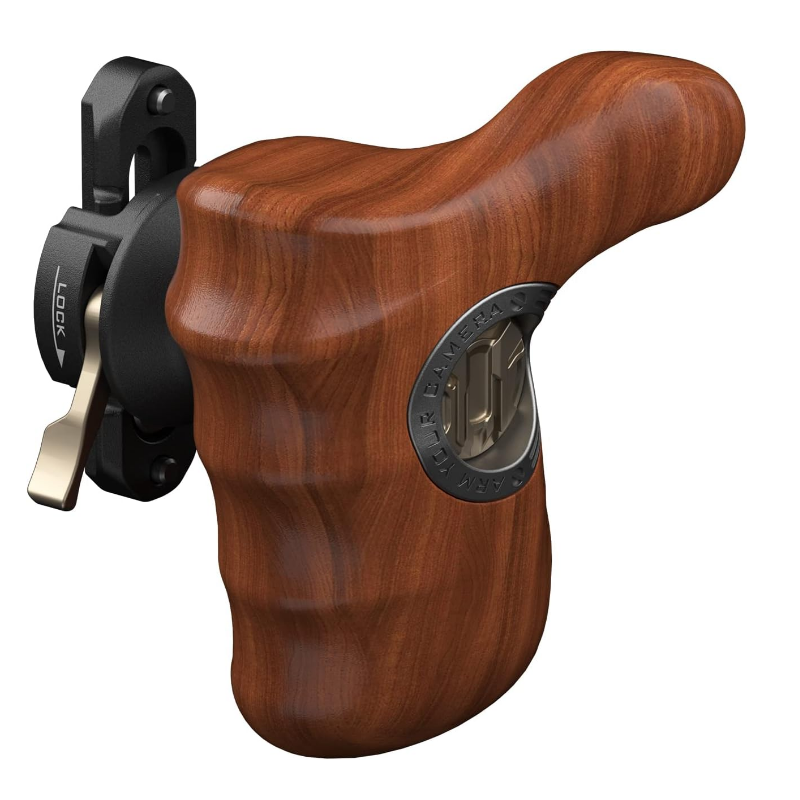 Questa impugnatura in legno presenta un design ergonomico per offrire il massimo comfort durante l'utilizzo di una telecamera di qualsiasi dimensione. Può essere fissata alla gabbia della telecamera tramite accessori per impugnatura laterale opzionali: Tipo VIII (NATO), Tipo X (Rosette) o Tipo XI (1/4"-20 con perni di posizionamento). Un pulsante di sblocco sul lato del supporto consente di regolare facilmente l'angolo dell'impugnatura per trovare la posizione operativa perfetta e di riposizionare rapidamente durante la regolazione per diverse riprese.