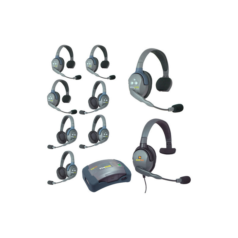L'Eartec HUB944MXS è un intercom professionale full-duplex per 9 persone che devono comunicare e lavorare con le mani. Questo sistema compatto include l'unità base HUB Mini da indossare alla cintura con una cuffia Max4G da collegare. Sono inoltre incluse 4 cuffie wireless UltraLITE Remote mono-auricolari e 4 cuffie wireless UltraLITE Remote bi-auricolari. UltraLITE utilizza una tecnologia wireless digitale avanzata (DECT) per fornire una comunicazione wireless professionale con conversazione simultanea in un raggio di un quarto di miglio.