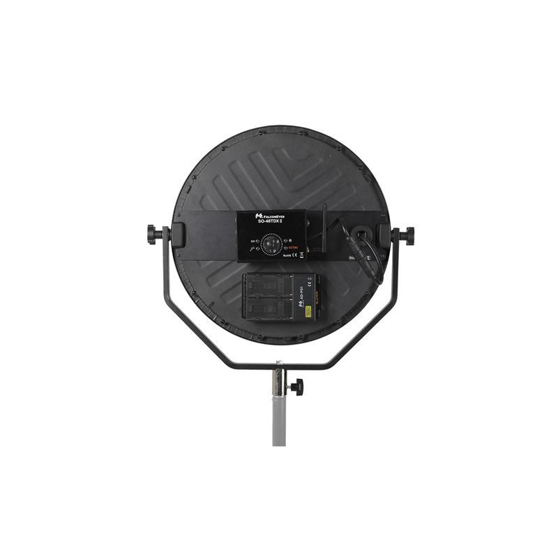 Questo kit include la lampada LED Falcon Eyes SO-48TDX, fornita con due batterie NP-F e un caricabatterie.