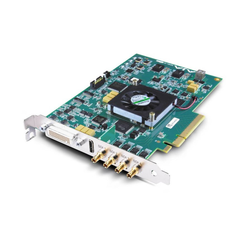 Grazie alla sua elaborazione hardware integrata, l'AJA KONA 4 R0-S05 può acquisire e trasmettere video 4K a frequenze di fotogrammi fino a 60 fps. Con questa risoluzione, è possibile visualizzare i dettagli della produzione in modalità nativa su un monitor 4K. Oltre alle risoluzioni 4K, la KONA 4 supporta I/O 1080p non compresso con sottocampionamento della crominanza 4:4:4 o 4:2:2. La KONA 4 può ricevere e trasmettere simultaneamente video non compresso tramite le sue porte 3G-SDI. Due porte accettano l'ingresso video mentre le altre due possono alimentare uno schermo professionale o trasmettere verso un registratore.