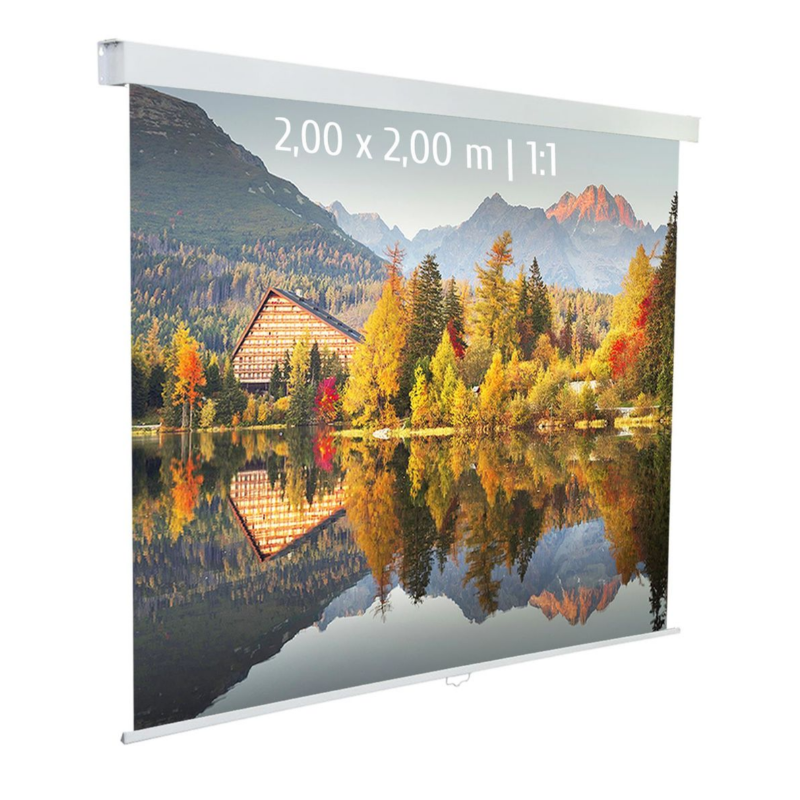 Lo schermo di proiezione manuale KIMEX 041-3623 offre un'immagine di 200 x 200 cm nel formato 1:1, ideale per proiettare tutti i contenuti in ambienti professionali o educativi.