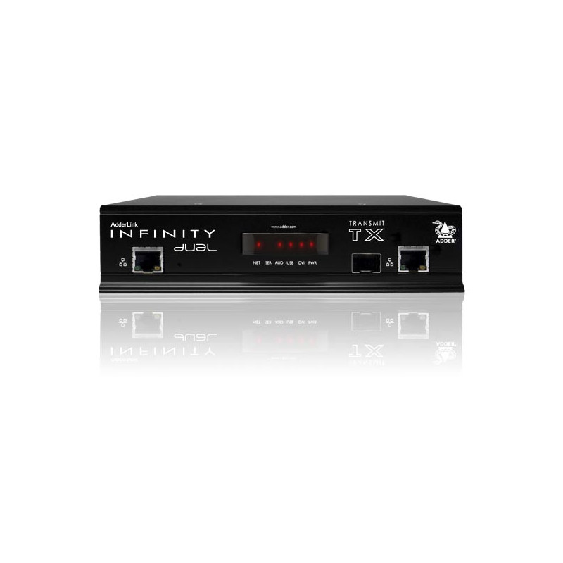 | Connessioni computer del trasmettitore (TX) | 2 x DVI-D, ingresso audio 3.5mm, uscita audio 3.5mm, USB tipo B, RS232 9 pin tipo D, 1 x 8p8c e 1 x SFP per connessioni di rete AdderLink Infinity. | |