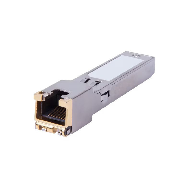 Modulo SFP da 1 Gbit/s con connettore 8p8c, adatto per il collegamento ai cavi CATX tramite un connettore RJ45. Conforme agli standard Gigabit Ethernet e 1000BASE-T specificati negli standard IEEE 802.3-2002 e IEEE 802.3ab. Supporta velocità di 1000 Mbit/s fino a 100 metri su cavo a doppino intrecciato non schermato di categoria 5.