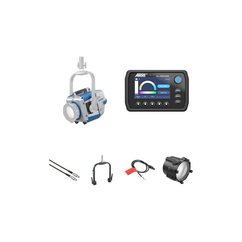 Il set ARRI Orbiter Fresnel comprende una luce Orbiter blu/argento con lente Fresnel da 15 a 65°, un giogo manuale, un pannello di controllo con cavo da 5 m e un cavo powerCON TRUE1 TOP da 3 m con estremità libere e interruttore in linea. Questo kit offre un angolo di zoom completamente motorizzato tramite controllo locale o remoto e può essere alimentato tramite corrente alternata o batterie da 48V.